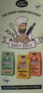 Knast-Kekse von Weltpartner sind jetzt ein neues Produkt im Weltladen. Diese werden in einer Gefängnis-Bäckerei auf Sizilien hergestellt, für einen fairen Neustart. Die Sorten sind in Bio-Qualität, saftig-soft, aromatisch, handgemacht, laktose- und