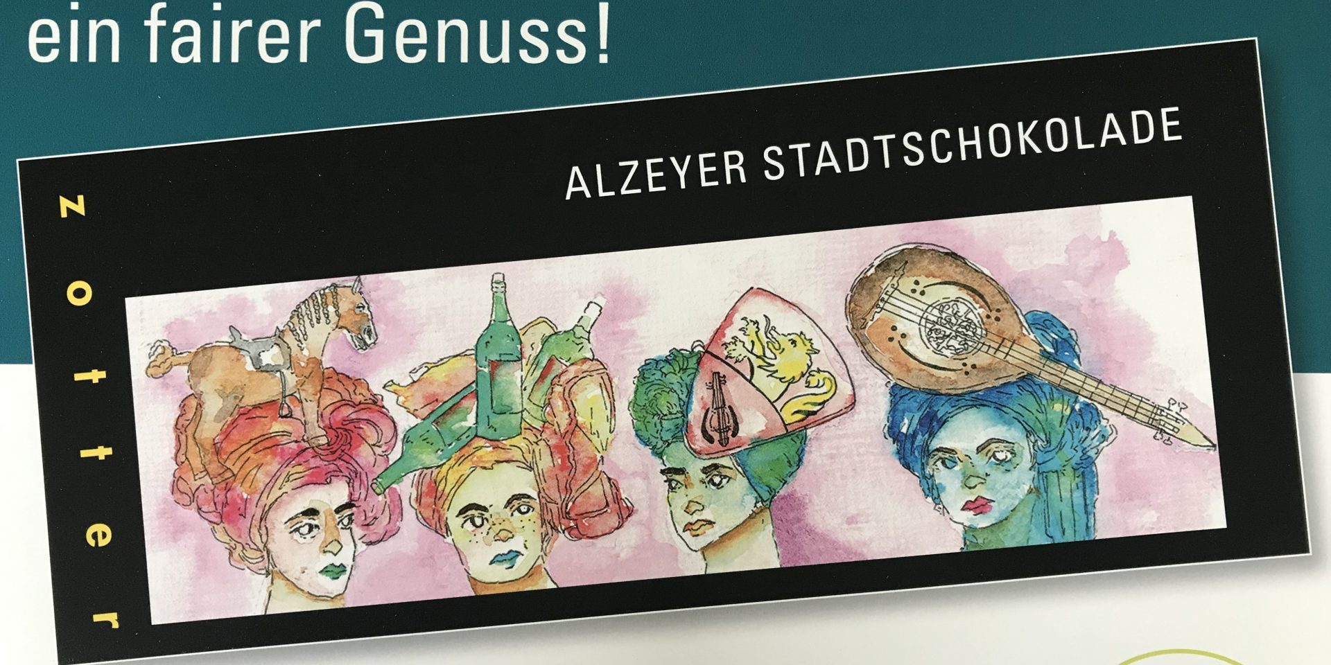 Die Alzeyer Stadtschokolade ist ein Gemeinschaftsprojekt der Fairtrade-Stadt Alzey mit dem Weltladen und dem Landes-Kunstgymnasium. Aus vielen gelungenen Entwürfen wurden drei Motive ausgewählt, die nun das Titelbild und die Innenseiten der Verpackung schmücken. Vier Kakaoproduzentinnen tragen würdevoll Alzeyer Attribute auf dem Kopf: Wein, Löwe sowie Fidel und Pferd von Volker von Alzey.