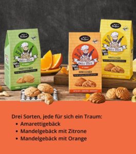 Gebacken wird mit hochwertigen, fair+bio-Zutaten: Mandeln, Zitronen und Orangen von italienischen Kleinbäuer*innen, Zucker von Manduvirá. Das Ergebnis sind handgemachte Kekse mit Charakter – und mit Wirkung weit über den Geschmack hinaus.