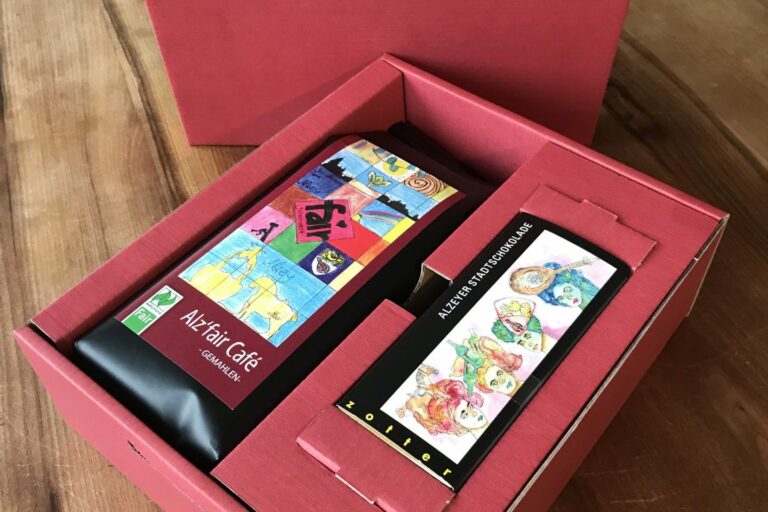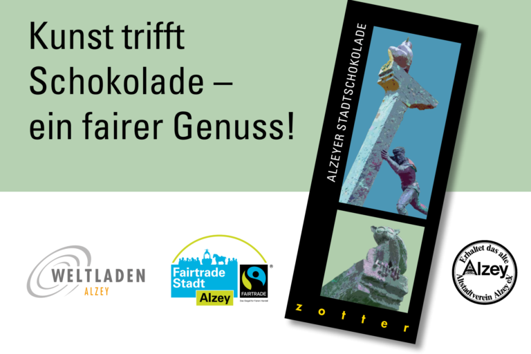 Die Fairtrade Stadt Alzey präsentiert im Weltladen Alzey die neue Stadtschokolade aus der Schokoladenmanufaktur Zotter, die in Zusammenarbeit mit dem Altstadtverein entstanden ist. Für das Titelbild wurde die Bronzeskulptur des Denkmalschützers ausgewählt und künstlerisch in Szene gesetzt. Den beliebten Alzfair Café kann man im attraktiven Geschenkkarton gemeinsam mit der Alzeyer Schokolade verschenken.