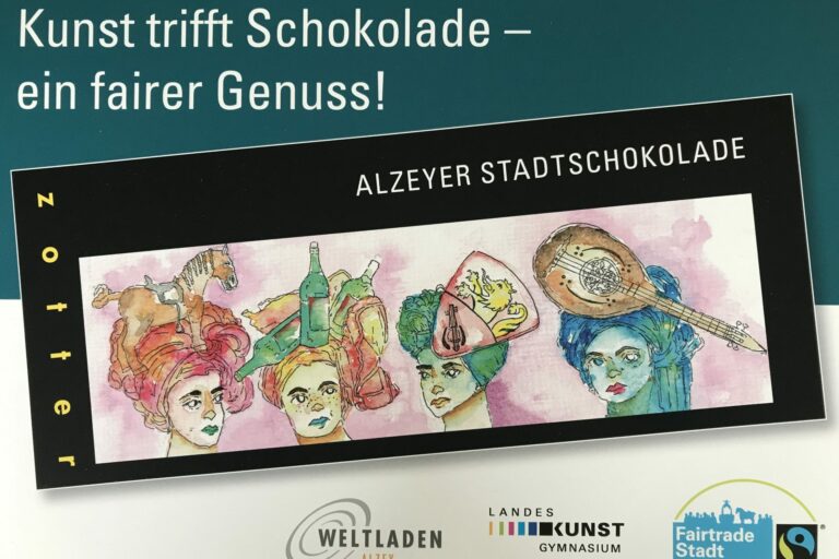 Die Alzeyer Stadtschokolade ist ein Gemeinschaftsprojekt der Fairtrade-Stadt Alzey mit dem Weltladen und dem Landes-Kunstgymnasium. Aus vielen gelungenen Entwürfen wurden drei Motive ausgewählt, die nun das Titelbild und die Innenseiten der Verpackung schmücken. Vier Kakaoproduzentinnen tragen würdevoll Alzeyer Attribute auf dem Kopf: Wein, Löwe sowie Fidel und Pferd von Volker von Alzey. Der Inhalt garantiert…