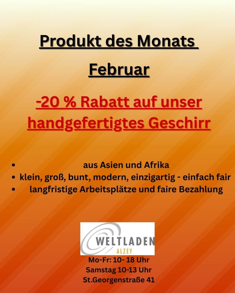 Produkt des Monats Februar 2026 Weltladen Alzey bietet im Februar an: 20% auf alle Geschirrartikel. Kommen sie vorbei. Lassen sie sich von der Vielfältigkeit unserer tollen Produkte verzaubern und erfahren Sie mehr über die Produzenten, ihre Länder und das Konzept des Fairen Handels. Geschirr klein, groß, bunt, einzigartig, modern und absolut fair produziert. Aus…