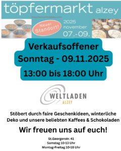 Anlässlich des Töpfermarkts Alzey laden wir euch herzlich zu einem verkaufsoffenen Sonntag im Weltladen Alzey ein.