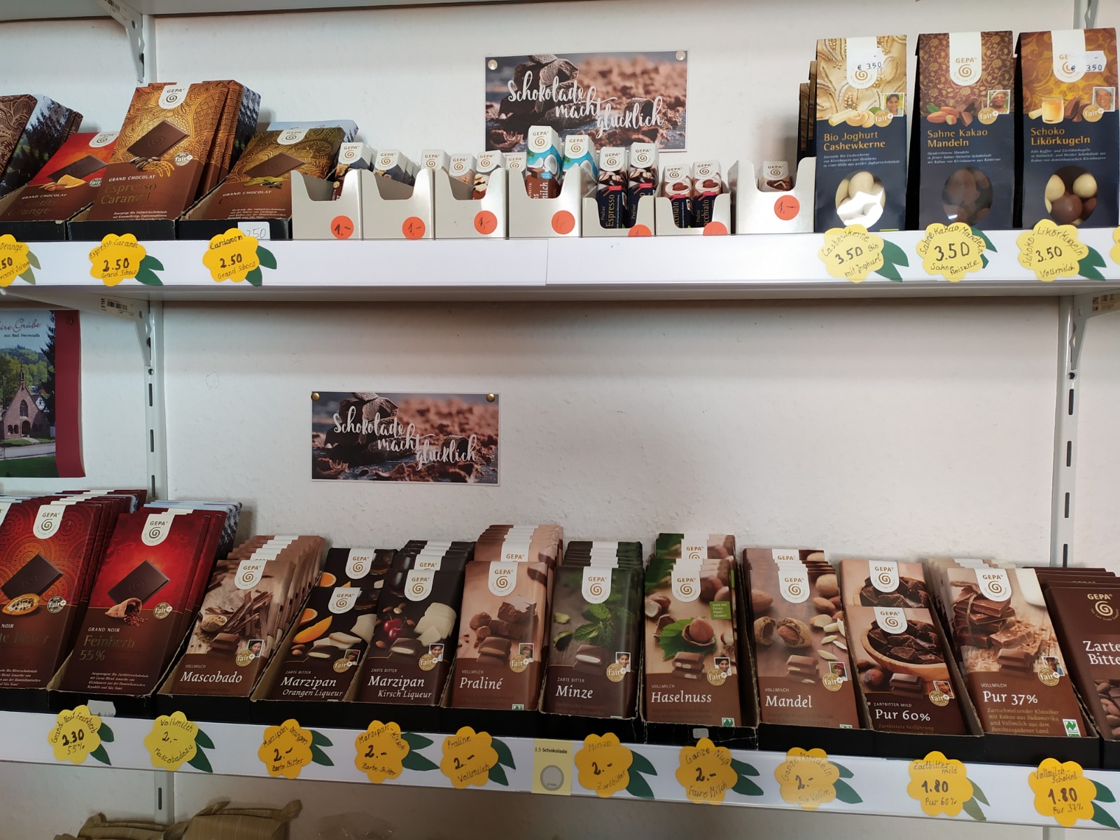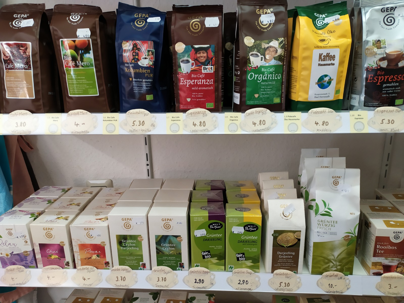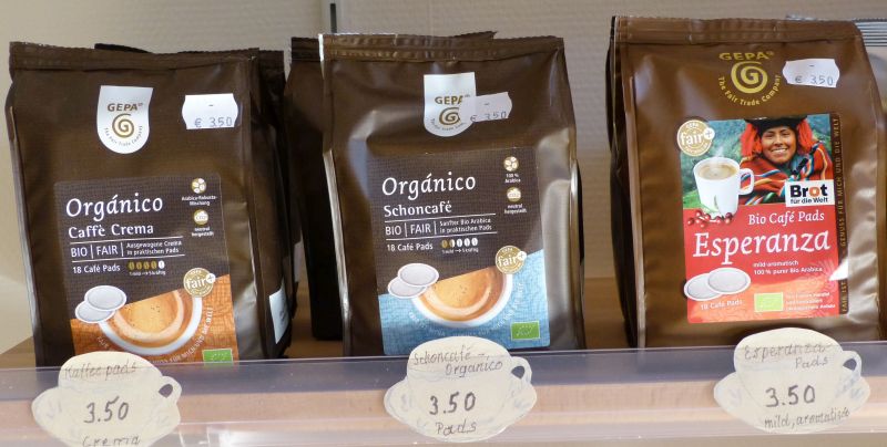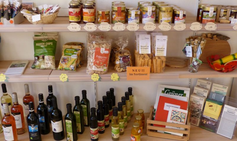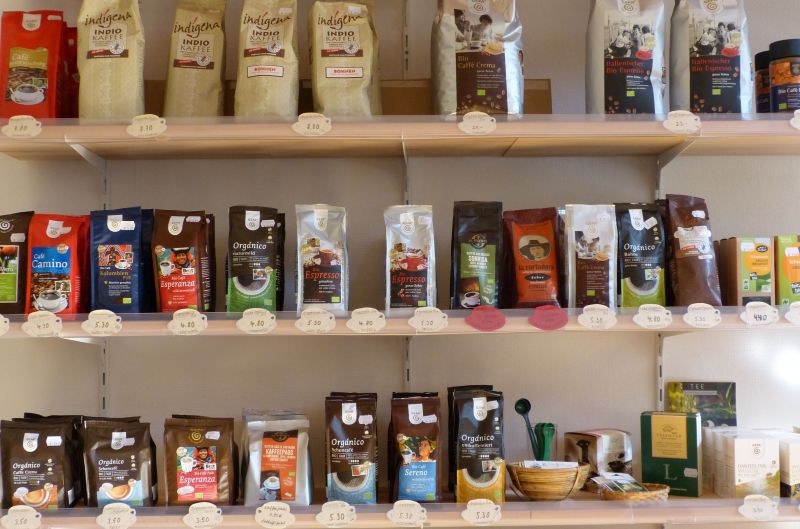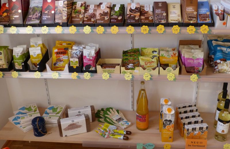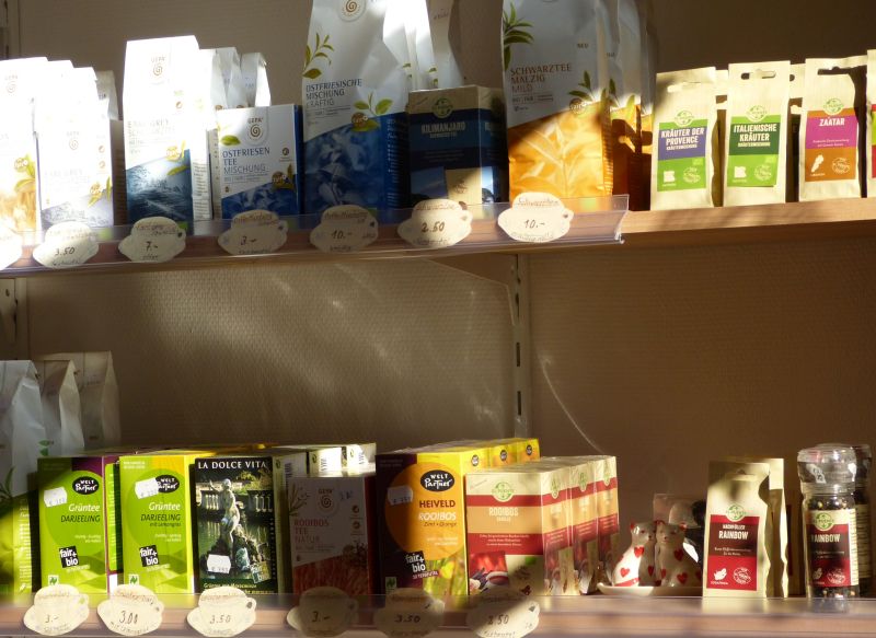 Es gibt bei uns Lebensmittel von Kaffee, Tee über Gewürze und Bad Herrenalb-Schokolade bis hin zu Reis und vielem Anderen.