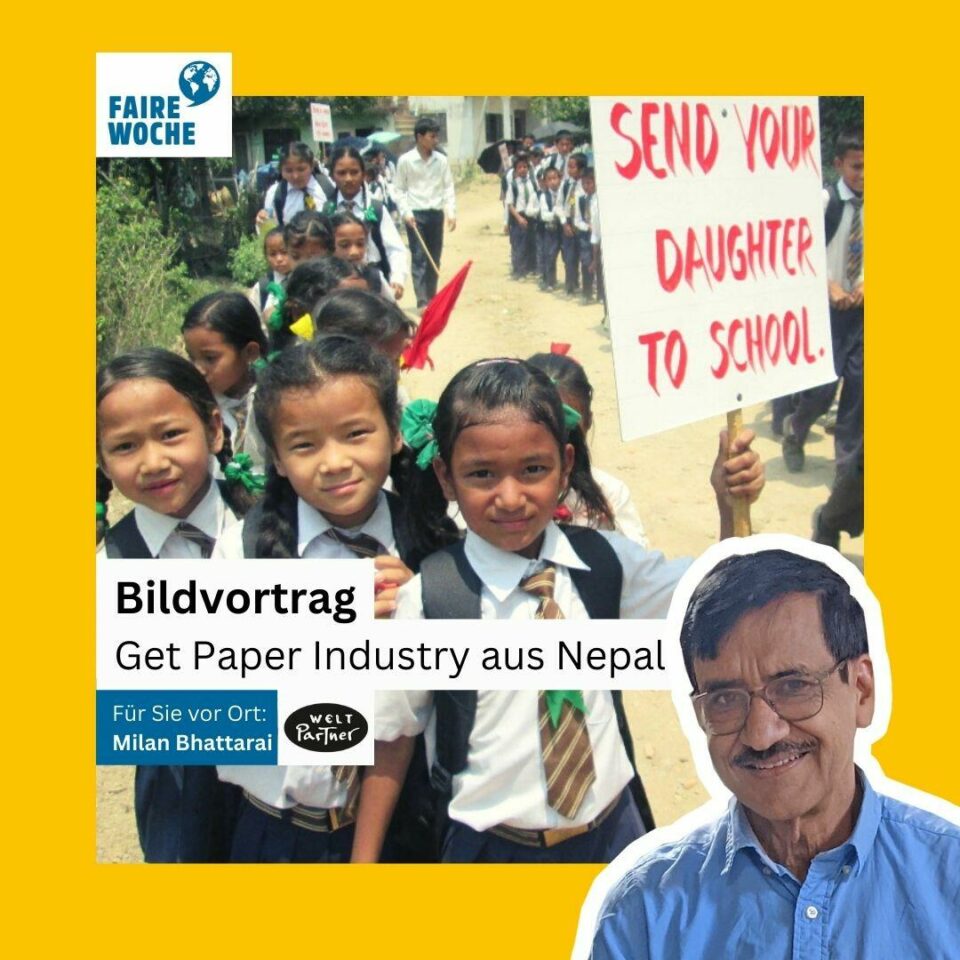 Zu Gast ist an diesem Abend Herr Milan Bhatterai von der Kooperative Get Paper 19:30 Uhr im Weltcafe Stuttgart, Eintritt frei! Get Paper Industry ist eine Kooperative, die handgeschöpftes Papier und Papierprodukte herstellt. Ziel ist es, traditionelles nepalesisches Handwerk zu nutzen, um Frauen, die an den Rand der Gesellschaft gedrängt werden, Beschäftigungsmöglichkeit mit guten Arbeitsbedingungen…
