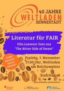 Der Weltladen feiert in diesem Jahr sein 40-jähriges Bestehen. Aus diesem Anlass findet eine weitere Veranstaltung im Weltladen Sennestadt, Reichowplatz 19, 33689 Bielefeld, statt. Ulla Loewner von der Buchhandlung Klack liest am 07.11.2025 um 17 Uhr aus dem Buch „The Bitter Side of Sweet“ von Tara Sullivan.