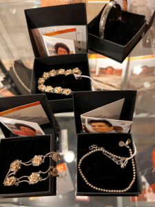 Das vielseitige Sortiment besteht aus Hals- uns Armbändern, Kettenanhängern, Ohrsteckern, und Ringen.