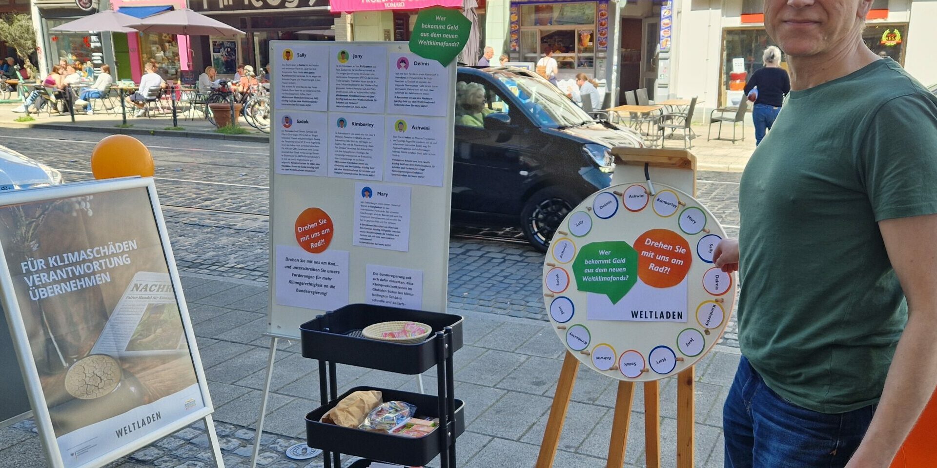 Zum Weltladentag, am 11.Mai, hatten wir zu einem politischen Fair Trade Fest eingeladen. Wer mit uns am Rad drehte, konnte sehen, wer Geld aus dem Weltklimafonds bekommt – besser: bekommen sollte. Denn unsere Beispiele standen für bestehende Klimaherausforderungen im globalen Süden, besonders für Kleinproduzent:innen.