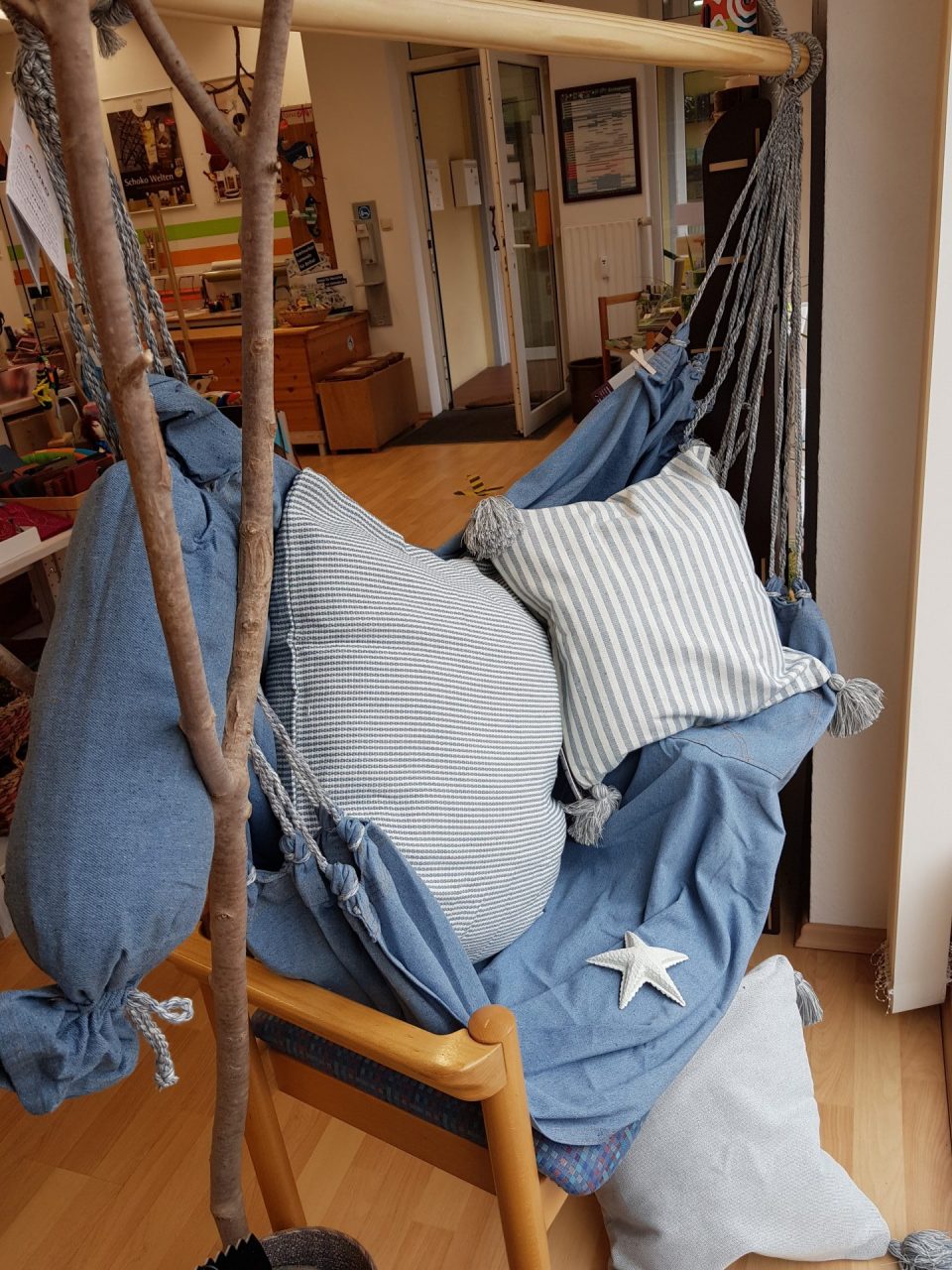 Hängestühle, Hängematten und Kissen aus fairer Produktion, teilweise aus recycelten Stoffen.
