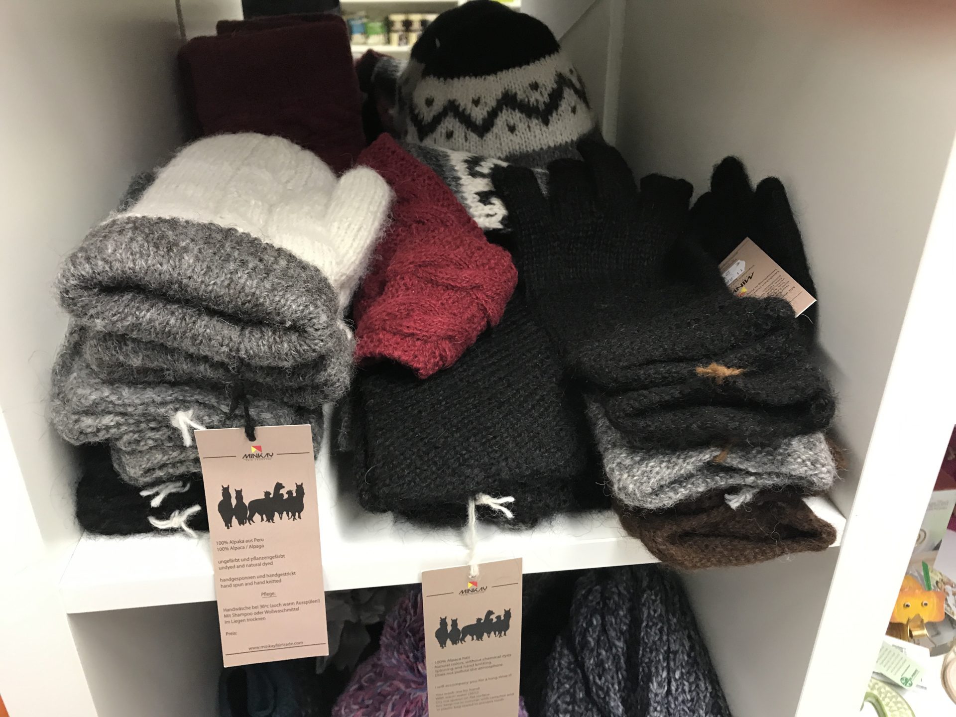 Passend zur kalten Jahreszeit ist frische Ware aus Alpakawolle von mariposa fairtrade und El Puente bei uns eingetroffen: Mützen, Handschuhe, Stulpen und absolut knuffige Lamas 🙂