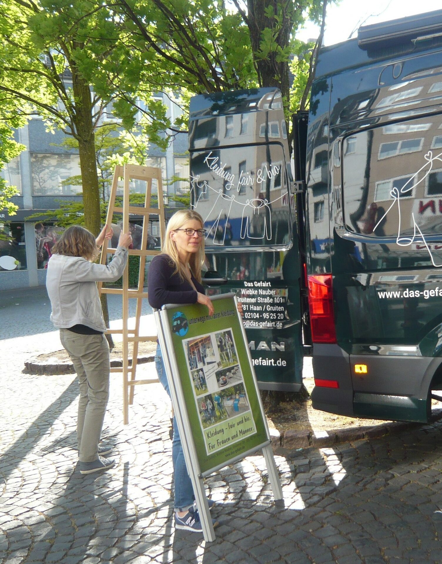 MÄCHTIG UNFAIR – unter diesem Motto stand der diesjährige Weltladentag. Ein Fenster im Weltladen war passend dekoriert. Wir hatten zum Thema „Lohndumping“ Wiebke Naube eingeladen. Ihr „Gefairt“ war gefüllt mit fair gehandelter, schöner Kleidung. Wir hatten einen besonderen Standort: Neben der „Dame in Rot“ auf dem Alten Markt in Borbeck fanden uns neue KundInnen und Interessierte, die das „Gefairt“ bereits im Herbst besucht hatten. Wir ergänzten das Angebot mit Waren aus dem Weltladen. Im September wird das „Gefairt“ wieder in Borbeck sein.