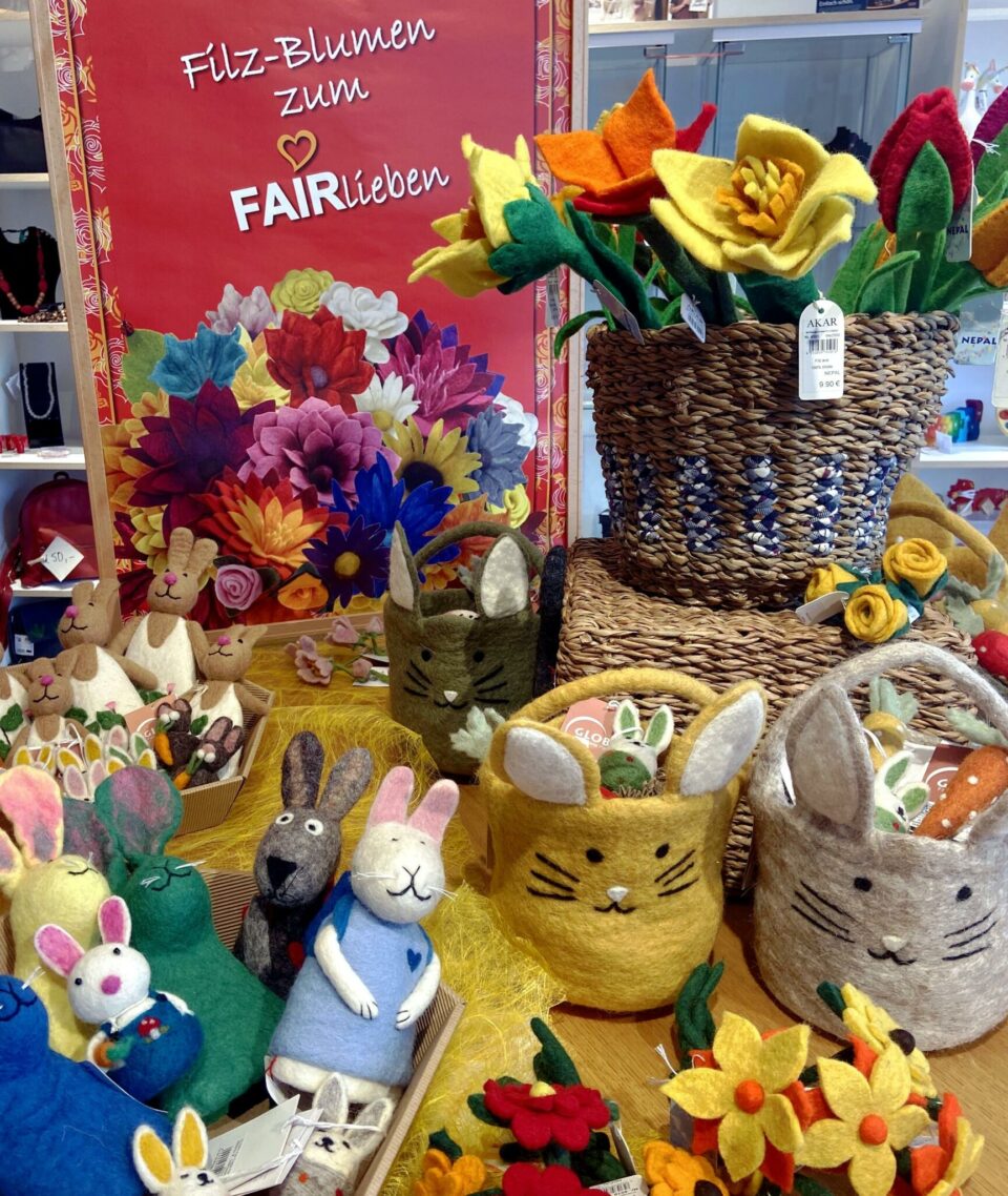 Passend zur Osterzeit bieten wir Filzprodukte unserer Lieferanten AKAR und GLOBO an: AKAR importiert als vom Weltladen-Dachverband anerkannter Lieferant seit 1994 traditionelle kunsthandwerkliche Produkte nepalesischer Fairhandelsproduzenten für die Weltläden in Deutschland und Österreich. Nähere Informationen: https://www.akarfairtrade.de/Ueber-uns Die Globo-Artikel aus Wollfilz kommen aus zwei Werkstätten in Kathmandu, Nepal. Beide Betriebe beschäftigen überwiegend Frauen, die in…