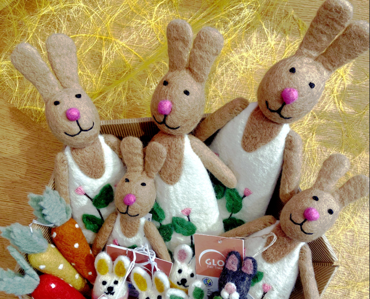 Auch in Kathmandu, Nepal, gibt es Osterhasen, wie diese Exemplare aus Filz beweisen. Die Globo-Artikel aus Wollfilz kommen aus zwei dort ansässigen Werkstätten. Beide Betriebe beschäftigen überwiegend Frauen, die in der näheren Umgebung wohnen und hier die Chance haben, ihr eigenes Einkommen zu erwirtschaften. Hohe Sozialstandards, geregelte Arbeitszeiten und nicht zuletzt eine sehr angenehme Arbeitsatmosphäre…