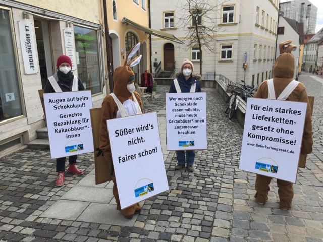 Augen auf beim Schokokauf: Woher kommt die Schokolade in den Ostereiern? Unter diesem Motto verteilten Aktive aus dem Fairen Forum Freising und dem Weltladen Freising am 27. März rund 30 Ostereier aus Papier in der Innenstadt. Klein und Groß waren eingeladen auf Ostereiersuche zu gehen. Das Papier-Ei dient als Gutschein und kann im Weltladen gegen…