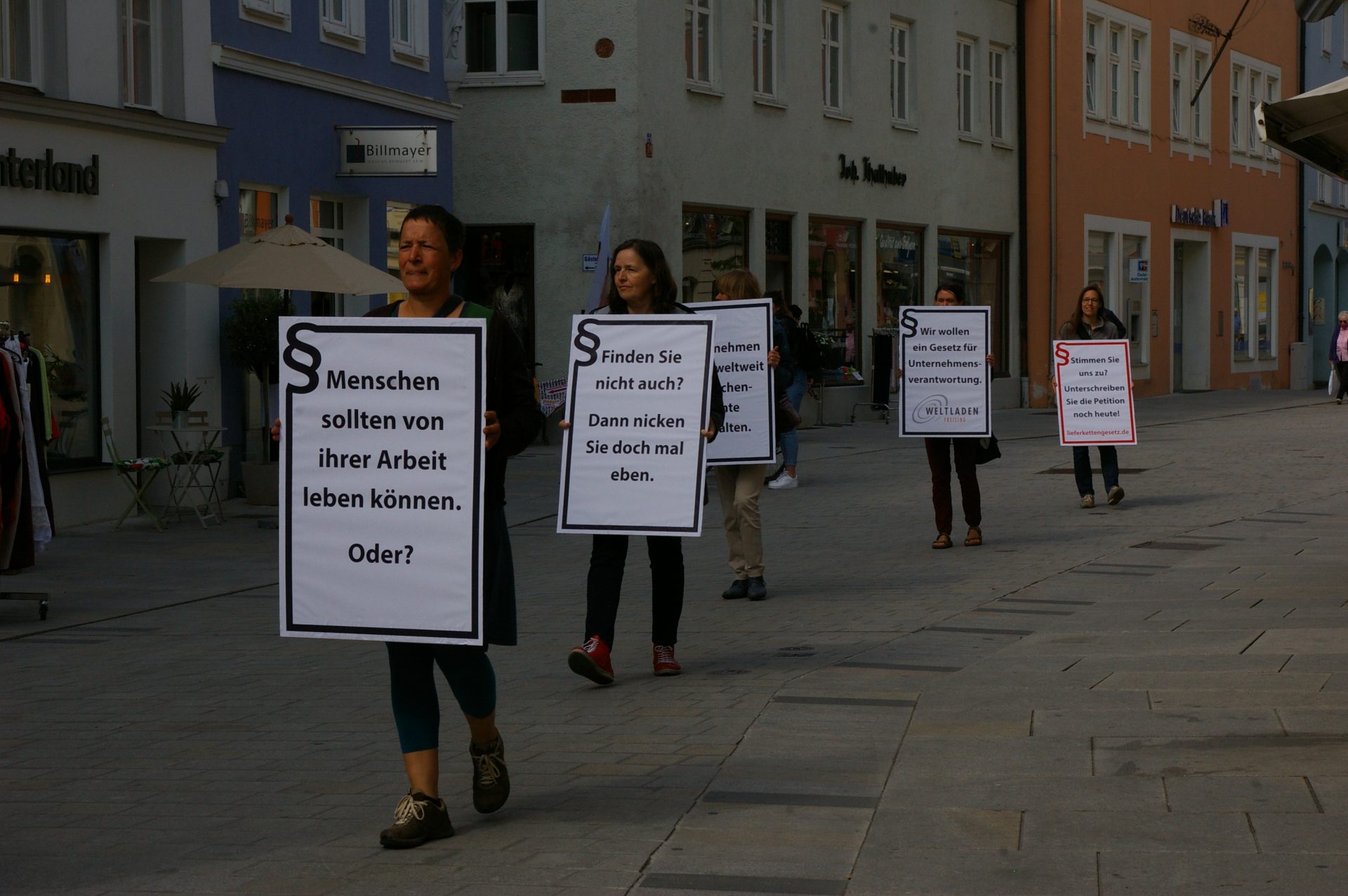 Das Bildungs- und Kampagnenteam des Weltladens Freising machte mit dieser Aktion am bundesweiten Weltladentag auf die Initiative Lieferkettengesetz aufmerksam.