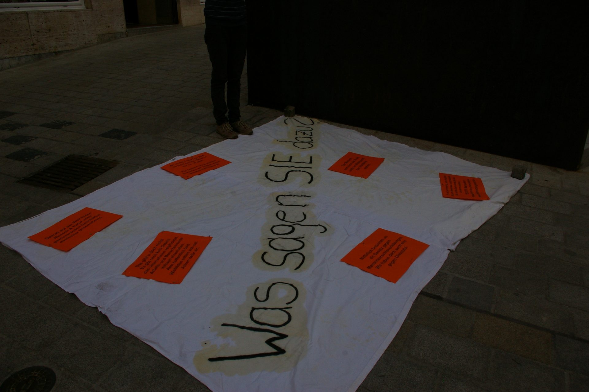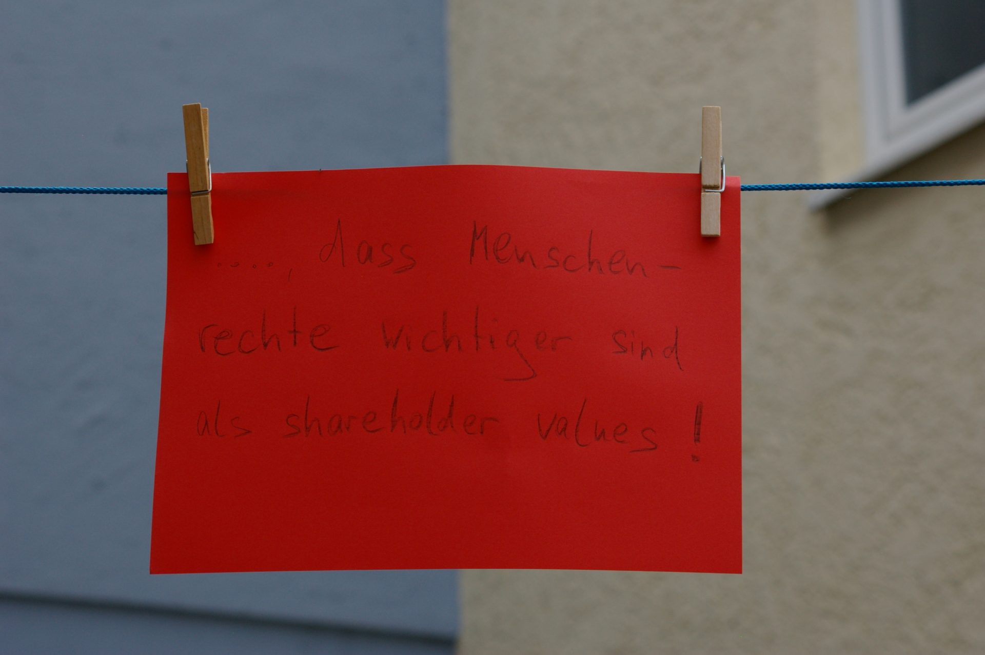 An anderer Stelle in der Innenstadt hatten sie ein Plakat auf dem Boden ausgelegt. In großen Buchstaben prangte den Menschen die Frage „Was sagen Sie dazu?“ entgegen. Wer stehen blieb, konnte sich von verschiedenen Aussagen zum Lieferkettengesetz inspirieren lassen.