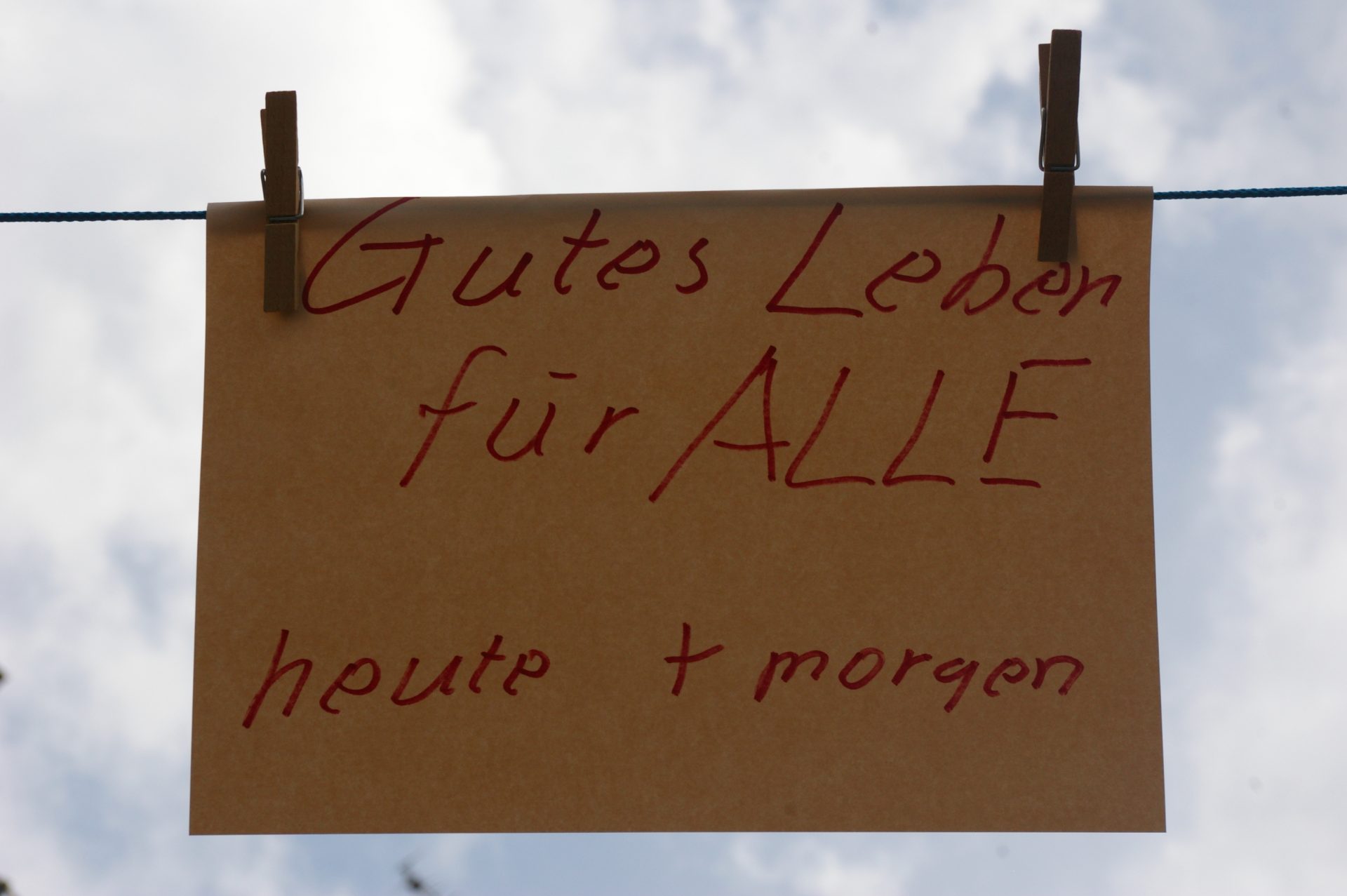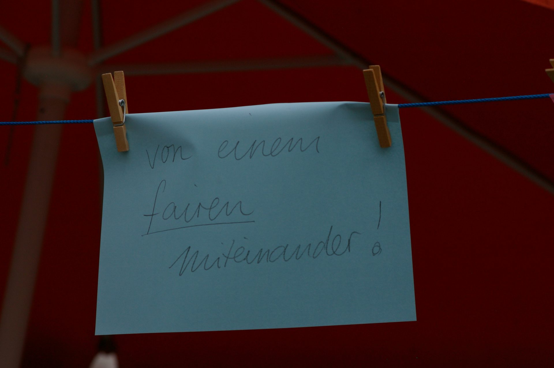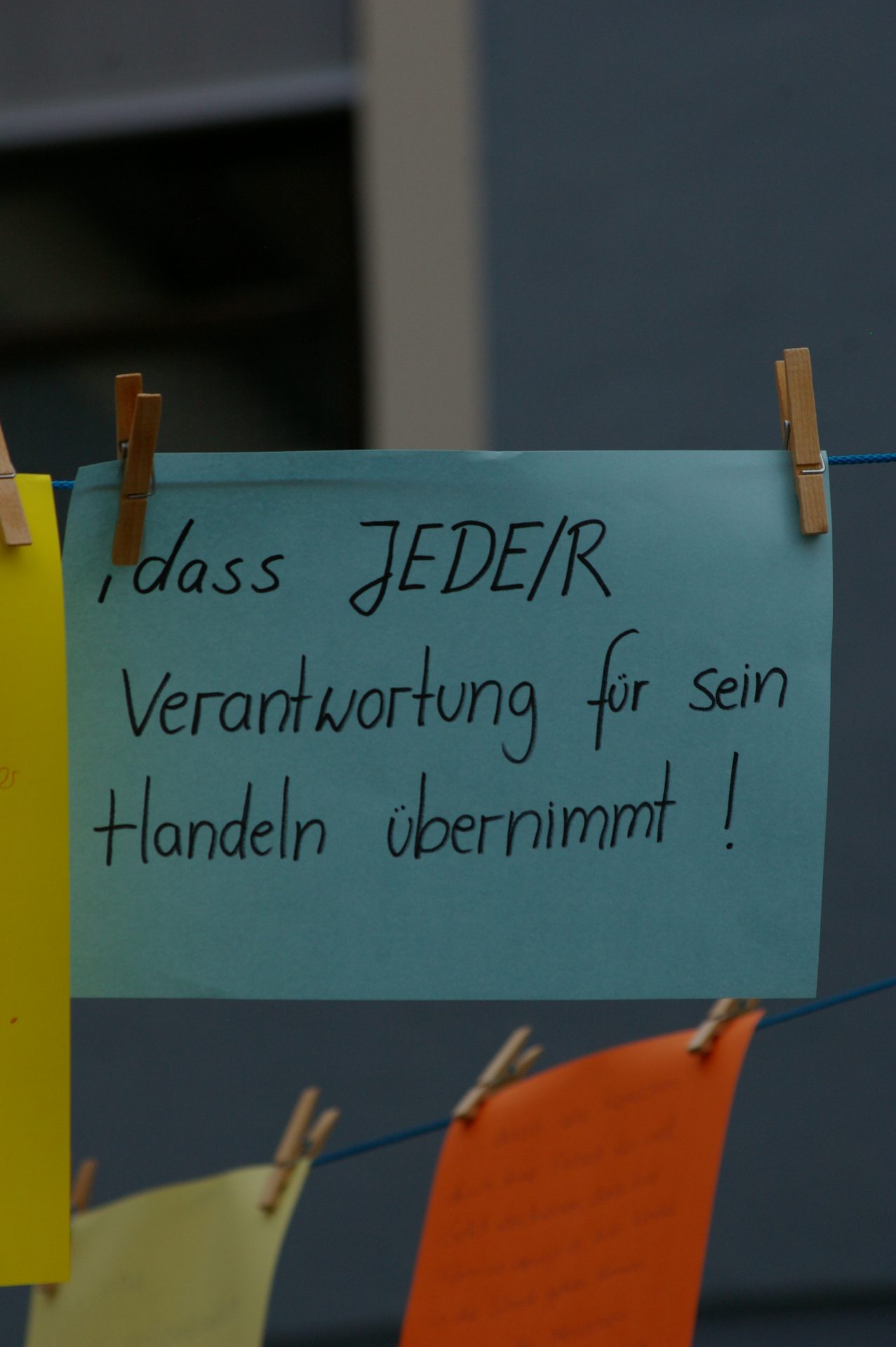Vorm Weltladen in der Ziegelgasse flatterten Zettel mit Träumen für eine gerechtere Welt im Wind. Interessierte konnten hier die Botschaft des aktuellen Schaufensters „Wir haben einen Traum …“ mit eigenen Wünschen und Visionen ergänzen.