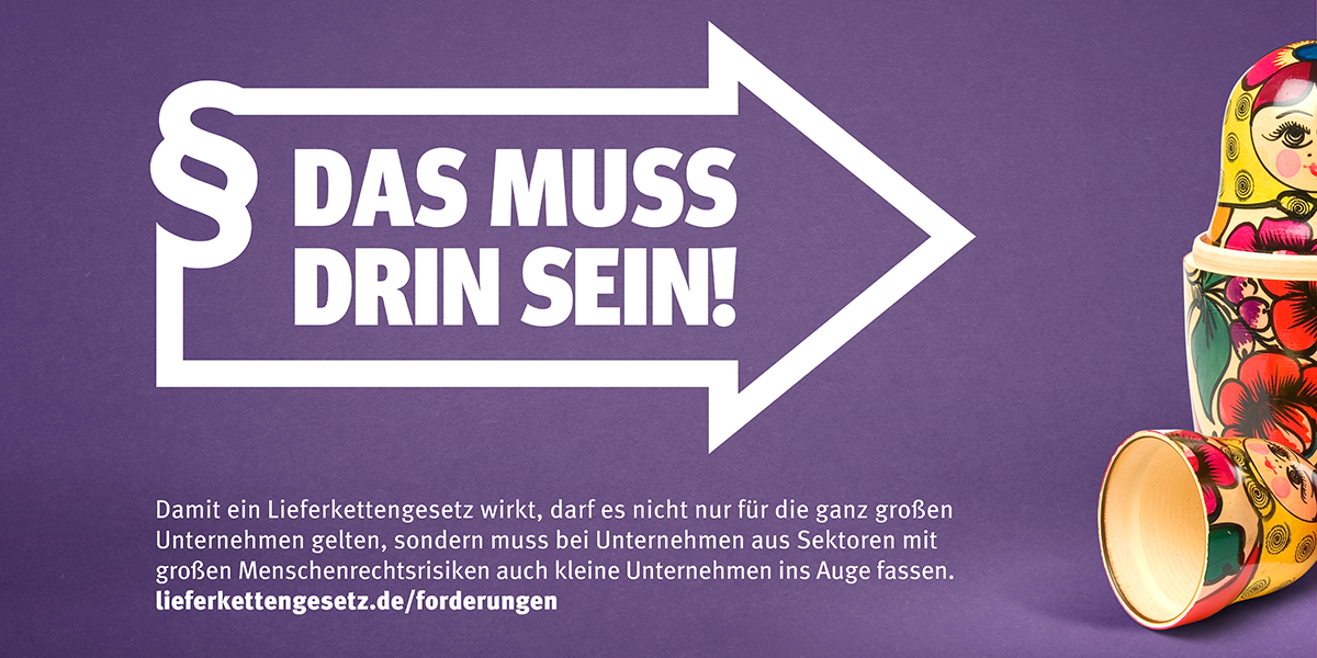 - Mailing: Die Initiative Lieferkettengesetz organisiert ein Mailing, an dem Jede*r individuell teilnehmen kann: Lieferkettengesetz.de
