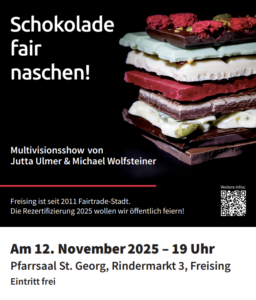 Schokolade gehört zu den beliebtesten Süßigkeiten weltweit. Wie aber wird aus Kakao, Zucker und Milch Schokolade hergestellt und wer verdient daran? Diesen Fragen gehen Dr. Jutta Ulmer und Dr. Michael Wolfsteiner in ihrer Multivisionsshow auf den Grund.