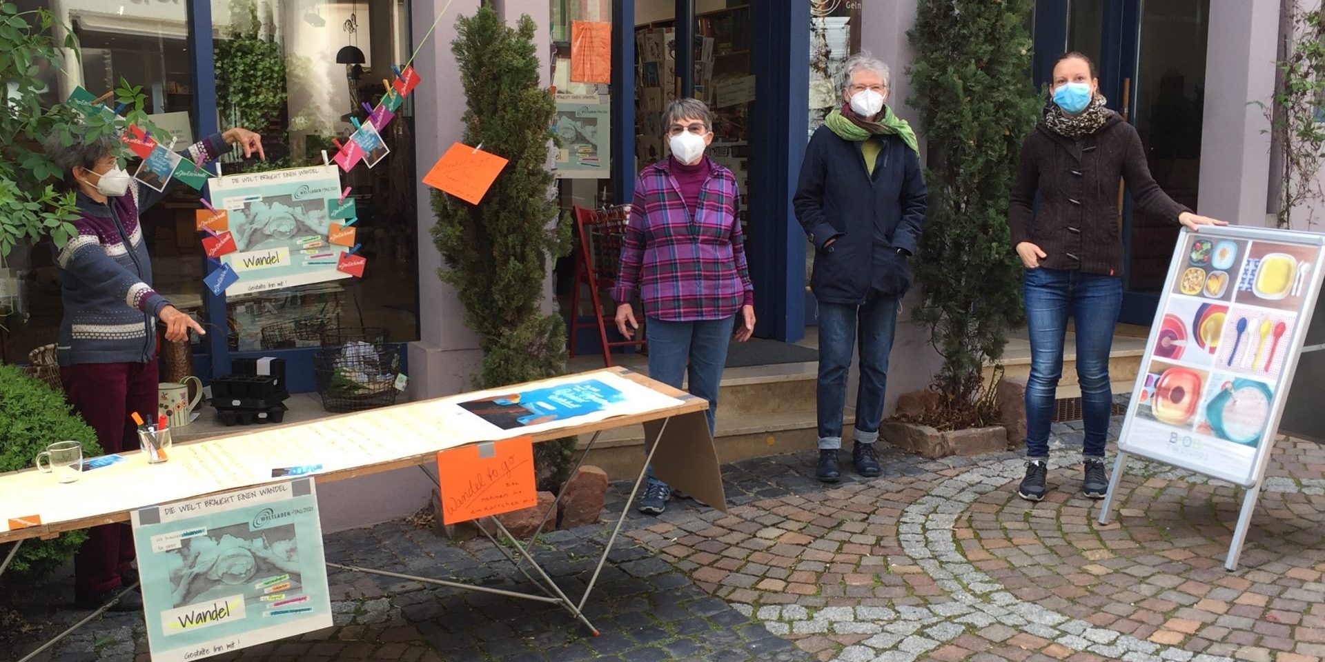Der Weltladen Gelnhausen hat sich am Weltladentag an einer bundesweiten Aktion beteiligt und dazu eingeladen, selbst aktiv zu werden und den Wandel mitzugestalten. Vor dem Laden hingen an zwei Tagen bunte Karten zum Mitnehmen, die als „Wandel-to-go“ Impulse enthielten, wie jede*r Einzelne im eigenen Alltag mehr Solidarität, Nachhaltigkeit und politisches Engagement umsetzen kann. Zusätzlich sammelte der Weltladen auf einer Tapetenbahn Ideen, wie der Wandel gemeinsam gestaltet werden kann. Diese ziert nun eine Wand im Weltladen und kann bei einem Besuch besichtigt und ergänzt werden. Auch die Impulskarten stehen dort weiterhin zur Verfügung.