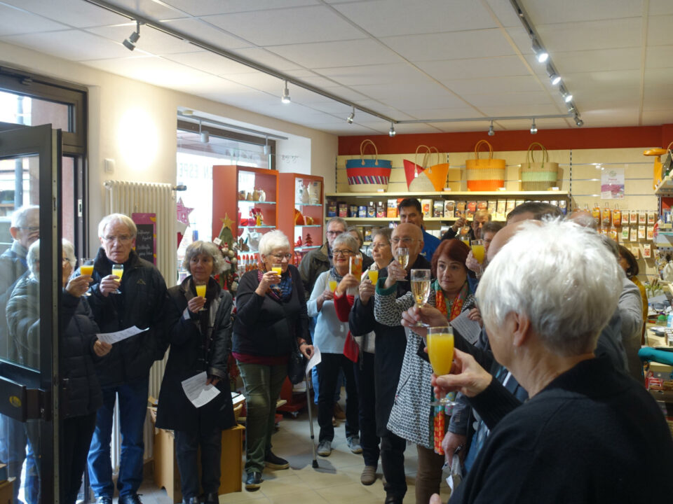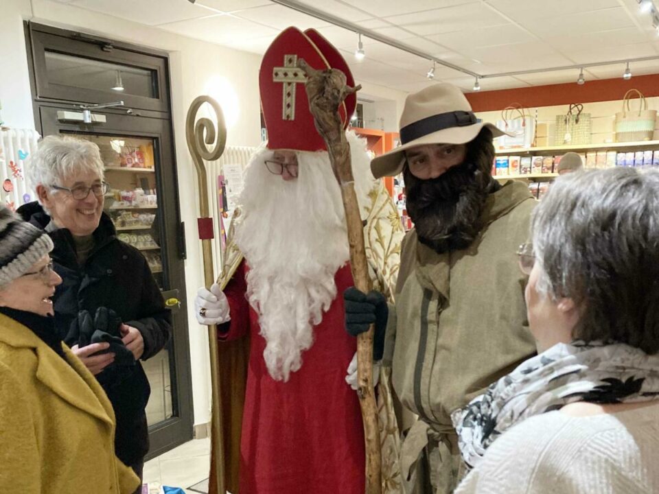 Während des „Adventszaubers um den Marktbrunnen“ am 3. Adventswochenende statteten der Nikolaus samt Knecht Ruprecht auch dem Weltladen einen Besuch ab. Für die ehrenamtlich Engagierten hatten sie kleine Geschenke dabei.