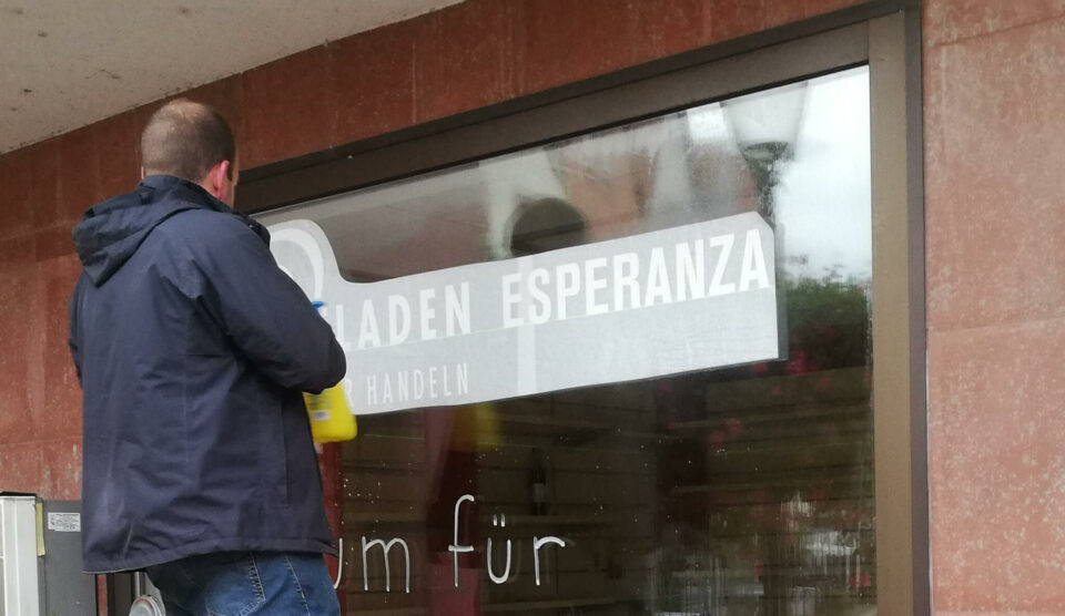 Gut sichtbar für alle, die auf dem Marktplatz unterwegs sind – der Ladenumbau geht langsam in die heiße Phase. Die Schaufensterbeschriftung wird angebracht und in etwas mehr als drei Wochen, am 06.11.2022, soll der Weltladen am neuen Standort feierlich eröffnet werden. Bis dahin ist aber noch allerhand zu tun, damit das Gemündener Fachgeschäft des Fairen…