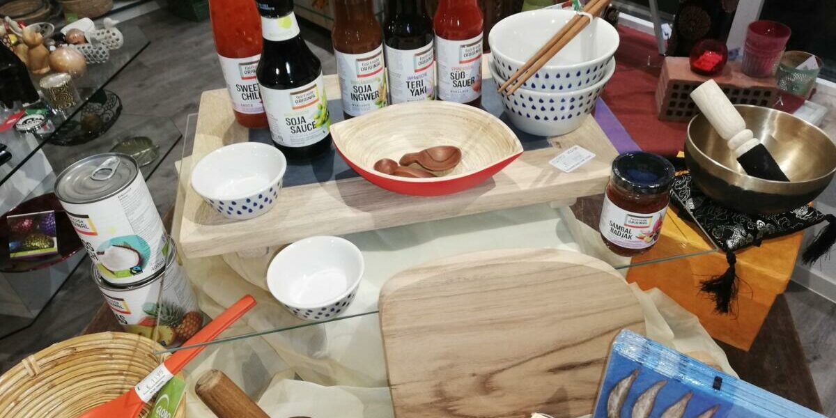 Kommt man derzeit in den Weltladen, dann fällt der Blick gleich auf den alten schwarzen Tisch, auf dem sich allerlei Dinge befinden, die unverkennbar zur asiatischen Küche gehören.