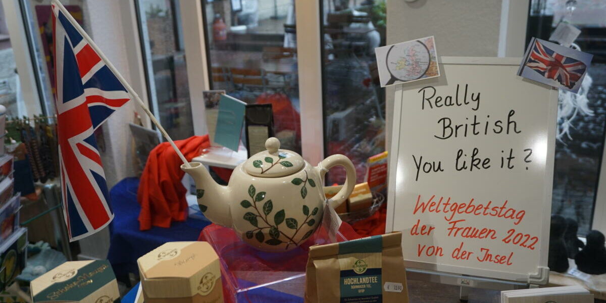 Ungewöhnliche Fahnen – ungewöhnliche Geschmäcker seit einigen Tagen im Gemündener Weltladen. Es dreht sich mal nicht um Afrika, Asien oder Lateinamerika – nein diesmal steht das Vereinigte Königreich im Mittelpunkt. Denn es ist Schwerpunktland des diesjährigen Weltgebetstags der Frauen, der traditionell Anfang März abgehalten wird. Aber natürlich gibt es im Weltladen deswegen jetzt keine Produkte aus Großbritannien, aber sehr wohl Produkte nach dem Geschmack der Englishmen, die aber wie gewohnt aus den Ländern des Südens kommen. Etwa Tee aus Indien oder Schoko-Nougat aus Südafrika. Who likes the taste of UK? Welcome to the Weltladen now….