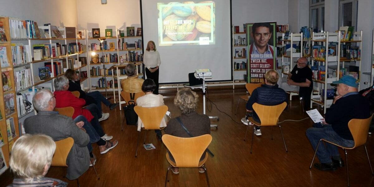 Mit einem Vortrag bei der VHS über Faire Geldanlagen gingen die Fairen Wochen 2021 in Gemünden zu Ende. Wegen Corona waren im Kulturhaus die Plätze limitiert und die waren dann auch fast alle besetzt als Karin Günther von der ökumenischen Entwicklungsgenossenschaft Oikocredit das Spektrum nachhaltiger Geldanlagen vorstellte, mit denen Oikocredit bereits seit 45 Jahren wirtschaftlich benachteiligte Menschen unterstützt. Mit dem Geld von 58.400 Anleger weltweit konnten bislang Kredite im Wert von 845 Mio € an 563 Partnerorganisationen vornehmlich in den Ländern des Südens vergeben werden. Darunter befinden sich auch 52 Organisationen des Fairen Handels. Alles in allem ein interessanter Abend unter reger Beteiligung all derer die gekommen waren.