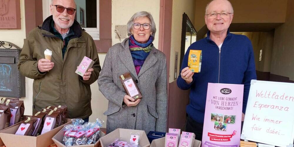 Bei teils widrigen Witterungsbedingungen musste der Weltladen seinen Stand beim Frühjahrsmarkt diesmal unter die Rathauspassage platzieren. Aber dort konnte man es dann auch bei den durchziehenden Regenschauern trocken aushalten. Diesmal wurden fairer Kaffee und Süßigkeiten angeboten, die man von Herzen FAIRschenken kann – insbesondere für Lieblingsmenschen. Aber viele Kunden fanden auch den Weg in den Laden, sodass wir am Ende trotz weniger Sonne bei diesem ersten Markt im Jahr sehr zufrieden sein können.