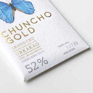 Die im Weltladen erhältlichen CHUNCHO GOLD Grand Cru Schokoladen sind echte Gourmet-Raritäten. Eine Sorte, eine Lage, ein Jahrgang, frei von Zusätzen. Sie sind durch Schweizer Chocolatierskunst veredelt, harmonisch im Geschmack und zartschmelzend.