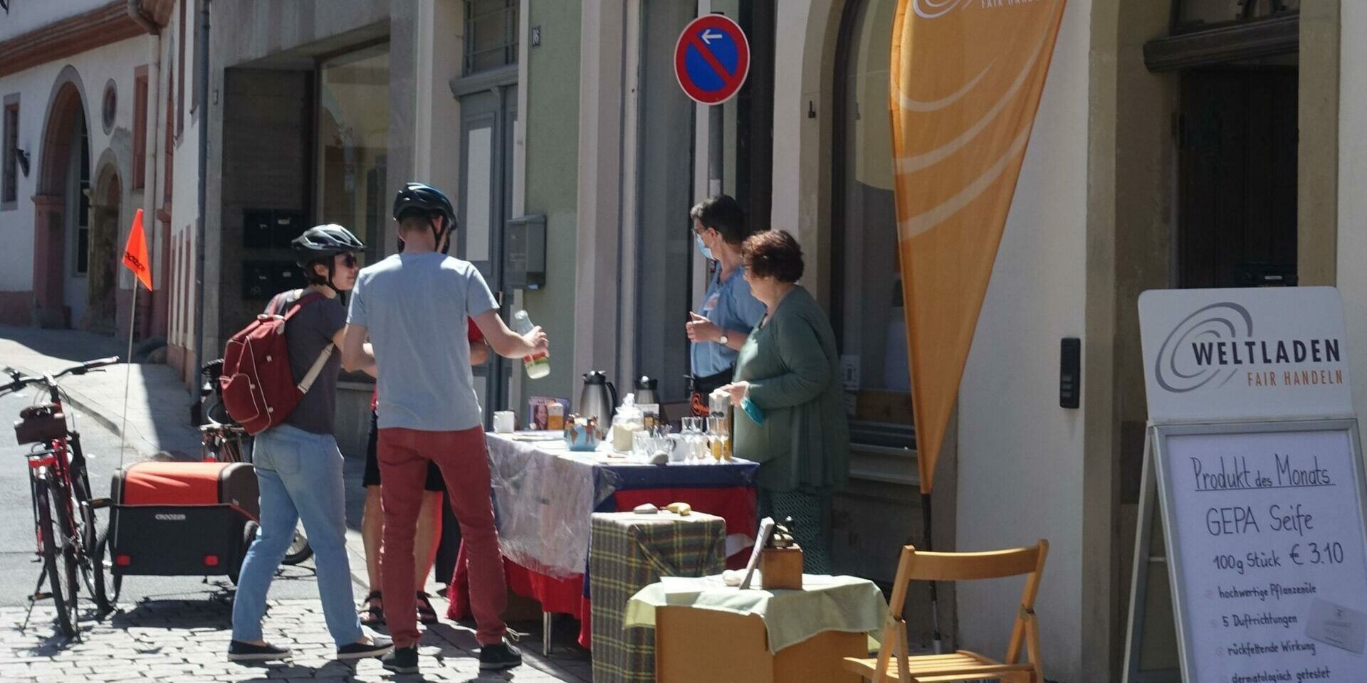 Mit einem eigens zum Motto des Weltladentages gestalteten Schaufenster haben wir auf die Dumpingpreise und damit auf die immer noch ungerechten Bedingungen in den globalen Lieferketten hingewiesen. Die mächtigen Konzerne übernehmen keine Verantwortung, sondern geben den Preisdruck an die kleinen und schwächeren Handelspartner weiter. Der scheinbare Vorteil, ein billiger Preis für Verbraucher und Verbraucherinnen, kommt uns allen durch die Ausbeutung von Mensch und Umwelt aber teuer zu stehen. Der faire Handel macht es anders: Dort bestimmen die Erzeuger*innen den Preis mit, es gibt Vorfinanzierung, langfristige Lieferverträge, Weiterbildung, Arbeitsschutz, und viele landwirtschaftliche Produkte sind Bio-zertifiziert. Über dieses Thema kamen die Weltladen-Aktiven mit Passantinnen und Passanten ins Gespräch und boten auch den neuen Kitzinger Stadtkaffee zum Verkosten an sowie weitere fair gehandelte Knabbereien.