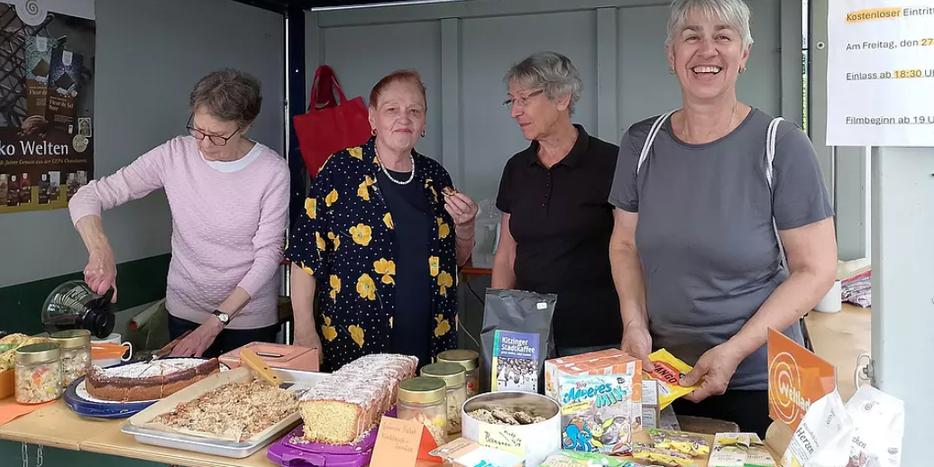 Dank einiger Spenden von fleißigen Ehrenamtlichen konnte sich die Eine-Welt-Gruppe mit Kaffeeausschank, Kuchen- und Quinuasalat-Verkauf auch dieses Jahr wieder am Nachbarschaftsfest beteiligen. Durch den nicht enden wollenden Regen waren trotz Bühnenprogramm und toller Musik die Gäste weniger zahlreich. So hatten diesmal auch die Helferinnen Gelegenheit, die angebotenen Speisen der Nachbarn aus verschiedenen Ländern selbst zu probieren und sich auszutauschen. Die fairen Produkte aus dem Weltladen fanden gar keine Abnehmer. Das war nicht verwunderlich, denn die Nässe trübte die Kauflaune sehr. Für alle Gäste gut sichtbar war am Stand eine Einladung für den Film „Made in Bangladesh“ ausgehängt, der demnächst im Roxy-Kino gezeigt wird und der sehr bewegend und spannend die Entwicklung einer jungen Textilarbeiterin in einer Männer dominierten Gesellschaft zeigt. Dieser Kino-Abend wird jedenfalls nicht durch mieses Wetter beeinträchtigt werden.