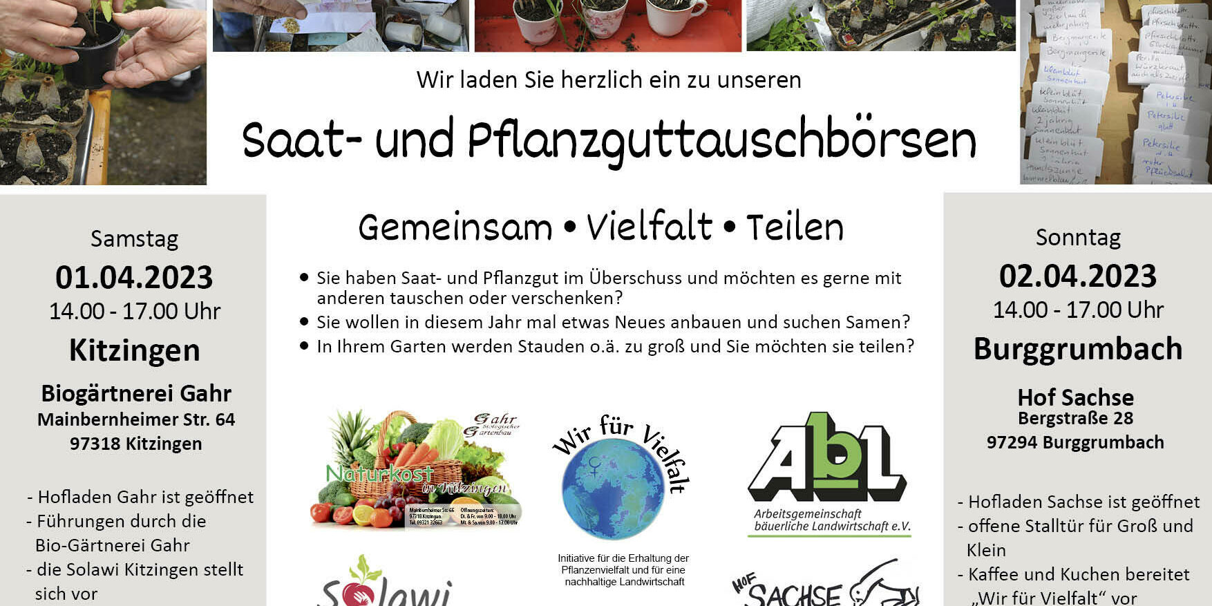 Wir haben bei der Pflanzen- und Saatgutbörse am 01.04. von 14.00 – 17.00 Uhr bei der Biogärtnerei Gahr in der Mainbernheimer Str. 64, wieder Kaffee- und Kuchenverkauf. Besuchen Sie uns. Mehr im Flyer.