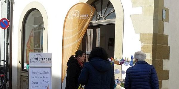 Viele Marktbesucher*innen waren auf unsere Aktion zum 8. Mai am Weltladentag gekommen. Die Welt braucht einen TAPETENWECHSEL – Gestalte ihn mit! Auf dieses Motto angesprochen, meinte ein Passant: „Tolle Aktion, dass Sie an diesem Tag zu Nachdenken, anregen“. An einer Wäscheleine waren Impulskarten aufgehängt, die Denkanstöße gaben u.a. zu den Themenbereichen Solidarität, Gleichberechtigung und partnerschaftliches Miteinander, Respekt und transparentes politisches Engagement.