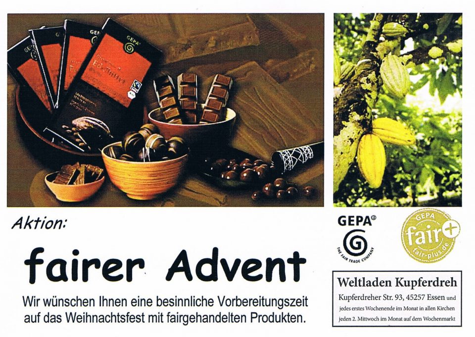 Die Orangen-Aktion “Süß statt bitter“, Orangen aus Italien unterstützt von der katholischen Kirche, Bistum Münster und der evangl.Kirche von Westfalen und den ökumenischen Eine-Welt-Gruppen westliches Ruhrgebiet möchte gegen die moderne Sklaverei (Flüchtlinge schuften auf Plantagen) ein Zeichen setzen. Diese Orangen gibt es ab sofort bei uns im Weltladen. Sie haben hohe Qualität und kosten 4,–…