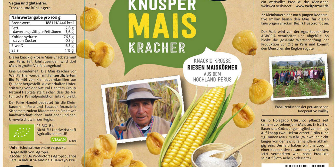 Die peruanische Kleinbauern-Kooperative AGROPIA kümmert sich um die Bewahrung und wirtschaftliche Nutzung fast ausgestorbener Kartoffelsorten. Seit 2017 verarbeitet AGROPIA für uns zudem den Cusco Riesenmais der noch jungen Kooperative Imillay, der 22 Kleinbauernfamilien angehören. Daraus entstehen zum Beispiel die beliebten WeltPartner-Maiskracher. Ebenso wie bei den Kartoffelchips bleibt die gesamte Wertschöpfung der Produktion vor Ort in Peru und kommt den Menschen der Region zugute.