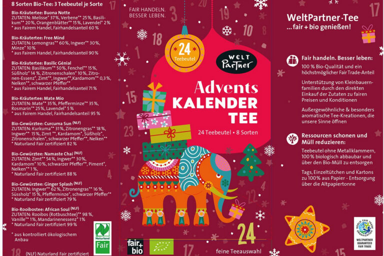 Überraschen Sie Ihre Freunde, Verwandte oder sich selbst mit einer adventlichen Tüte. Die Mitarbeiter vom Weltladen Kupferdreh bringen Ihnen die Tüte pünktlich zum ersten Advent vorbei (Lieferungen nur nach: Kupferdreh, Dilldorf, Byfang, Heisingen, Überruhr, Burgaltendorf, Niederwenigern, Niederbonsfeld). Die Tüte enthält fair gehandelte Produkte im Werte von 20,00 Euro. Das kommt in die Tüte: 250 g…