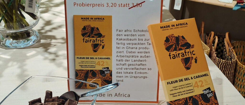 In diesem Monat gibt es bei uns die leckere fairafric „Fleur de Sel & Caramel“ zum Angebotspreis. Die Schokolade wird vom Kakaobaum bis zur verpackten Tafel in Ghana produziert. Kommen Sie gerne vorbei und probieren Sie.