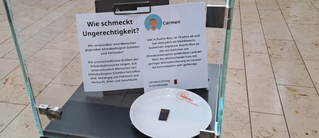 Anlässlich des 10.Jubiläums der Fairtradestadt Lingen ist im Lookentor auch die kleine Ausstellung „Wie schmeckt Ungerechtigkeit? zu sehen. Anhand von Schokoladenstückchen wird deutlich wie unterschiedlich Menschen von Klimaschäden betroffen sind.