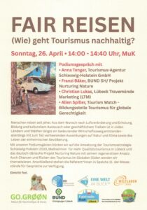 Unsere Podiumsgäste sind Anna Tenger (Tourismus-Agentur Schleswig-Holstein GmbH), Christian-Martin Lukas (Lübeck Travemünde Marketing), Franzi Bäker (BUND, Projektleitung Nurturing Nature) und Alien Spiller (Tourism Watch – Bildungsstelle Tourismus für globale Gerechtigkeit).