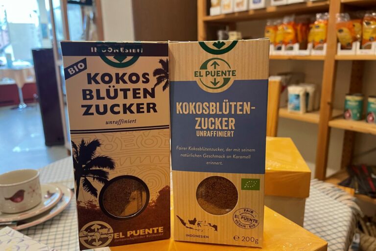 Bio-Kokosblütenzucker von El Puente Der Kokosblütenzucker schmeckt nicht – wie seine Herkunft vermuten lässt – nach Kokos. Er besticht durch eine volle, kräftige Karamellnote und lässt sich ebenso wie normaler Haushaltszucker zum Süßen von Gebäck, Kuchen, Desserts und Getränken verwenden, enthält jedoch mehr Nährstoffe. Die Kokosblüten liefern den braunen Zuckersaft, der unter ständigem Rühren über…