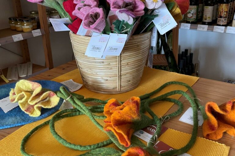 2023-09-29 Filzblumen aus Nepal Holen Sie sich den Sommer zurück – mit bunten Filzblumen aus Nepal. Ob Callas, Hibiskus, Trompetenblumen, Tulpen oder Stiefmütterchen, ob rot, rosa, lila, orange oder gelb, ob als Blume oder Girlande – die Blüten sind dekorativ und machen gute Laune. Die Filzblumen kommen aus zwei Werkstätten in Kathmandu, Nepal. Beide Betriebe…