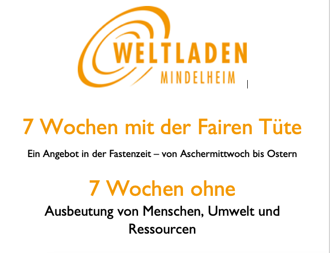 Der Erfolg der Fastenaktion im letzten Jahr hat uns ermutigt, auch heuer wieder unsere fairen Fastentüten anzubieten. 7 Fastenwochen mit 7 Tüten, die Lebensmittel enthalten, die ohne Ausbeutung von Menschen und Umwelt produziert wurden. Sie kommen in jedem Fall aus dem Fairen Handel, sind fast immer biologisch angebaut und schmecken außerdem noch sehr gut. Um…