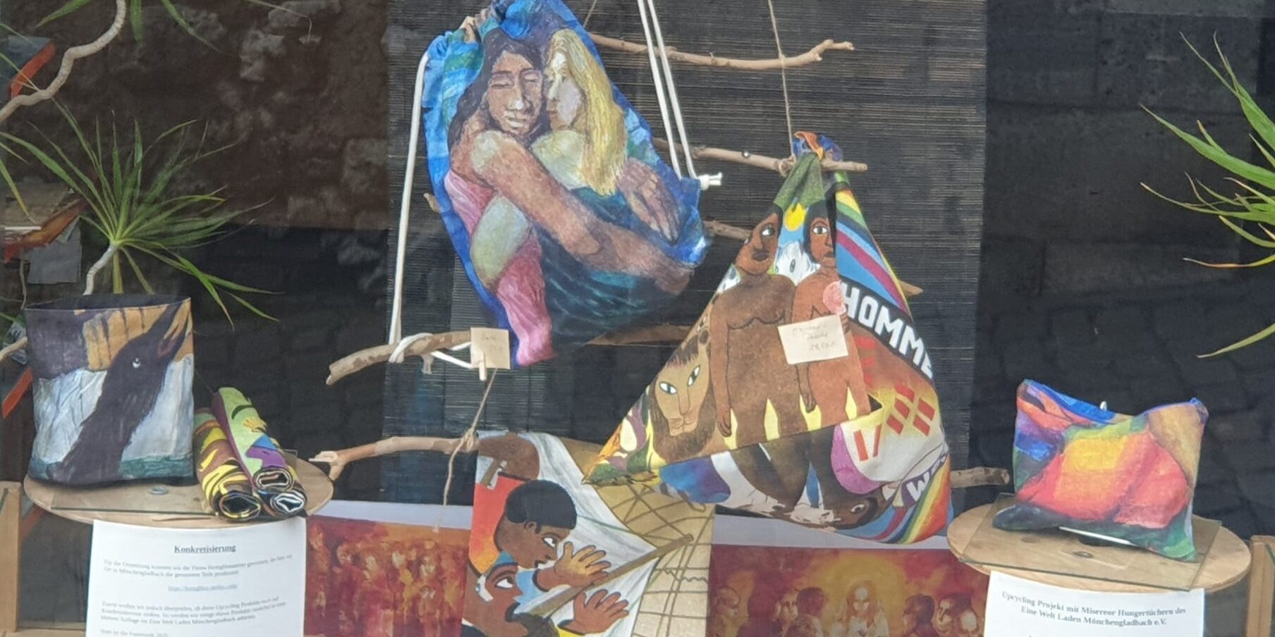 Unserem Laden wurden Hungertücher zur Verfügung gestellt, die in den Gemeinden, Gruppen und Schulen nicht mehr gebraucht wurden. So kam die Idee auf, mit den Tüchern der vergangenen Jahre ein Upcyling-Projekt zu starten. Als Eine Welt Laden sind wir mit den angesprochenen Themen der Hungertücher eng verbunden. So sind erste, alltagstaugliche und nachhaltige Produkte in einer kleinen Auflage vom Honigblut Atelier in Mönchengladbach gefertigt worden. Für Finda Bektaᶊ, die Gründerin von Honigblut, ist Upcycling die schonendste Methode, um verantwortungsbewusst mit der Umwelt umzugehen (honigblut-atelier.com). Es gibt Rucksackbeutel, Tischsets, raffinierte Origamitaschen, Allzwecktäschchen und Brotkörbe. Jedes Stück ist ein Unikat. Wir sind gespannt auf Ihr Feedback.
