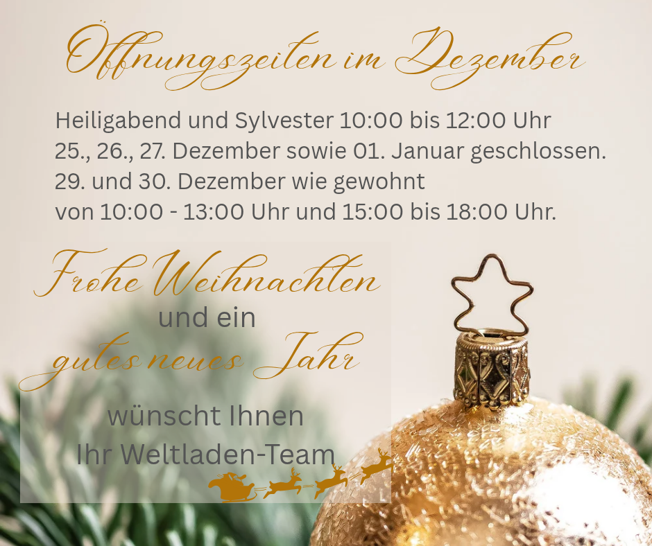 Von stilvoller Dekoration über besondere Geschenkideen bis hin zu köstlichen Leckereien findest du bei uns im Weltladen alles, was Weihnachten einzigartig macht – und Produkte, die die Welt ein Stück gerechter werden lassen.