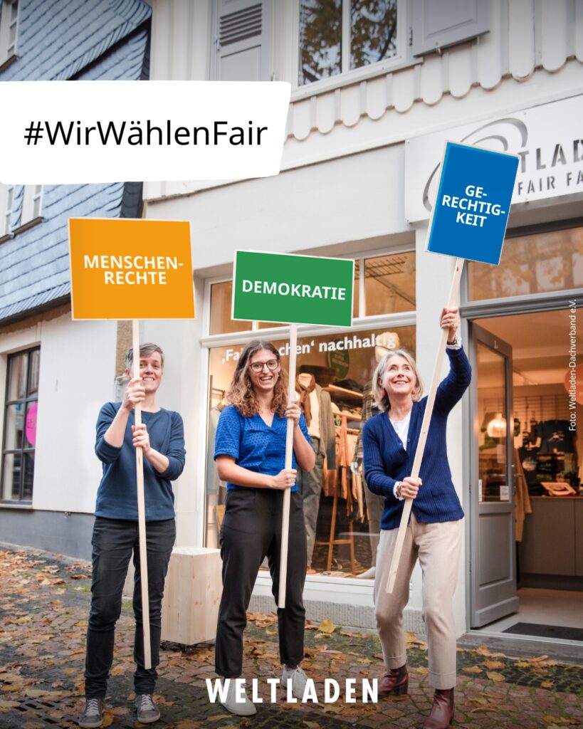 16. März 2026 Mit der Botschaft #WirWählenFair setzen die Weltläden ein Zeichen für Menschenrechte, Demokratie und Gerechtigkeit und rufen dazu auf, sich entschieden gegen Hass, Diskriminierung und Ausgrenzung zu stellen. „Die Grundgedanken des Fairen Handels beruhen auf Gerechtigkeit, Verständigung, Respekt und der Wahrung der Rechte und Würde aller Menschen weltweit. Die Vision des Fairen Handels ist eine Welt, in der für alle Menschen die Chance auf eine selbstbestimmte Zukunft besteht und in der jede*r unter menschenwürdigen Bedingungen arbeiten und einen angemessenen Lebensunterhalt bestreiten kann.“ So positioniert sich das Forum Fairer Handel, unser Verband für den Fairen Handel in Deutschland: „Nur gemeinsam können wir unsere Grundrechte und die Demokratie schützen.“ Und jeder Einkauf im Weltladen leistet hierzu einen wertvollen Beitrag!