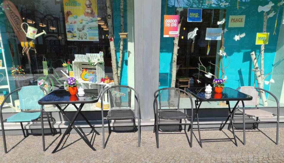 Ab sofort laden Tische und Stühle dazu ein, vor dem Weltladen zu verweilen. Im Angebot sind Kaffee, Espresso, Tee, Orangenlimonade, Mate-Limo und Cola. Unsere kleinen Waffeln, Schokoriegel oder Nüsse eigenen sich dazu als kleiner Snack.