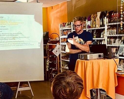Beim Netzwerktreffen gab der Sozialunternehmer Jens Klein von Café Chavalo spannende Einblicke in die Welt des fairen Kaffeehandels und erläuterte, welchen Beitrag seine genossenschaftlich organisierte Kooperative für einen fairen, nachhaltigen und bewussten und Kaffeehandel- und Konsum leistet: