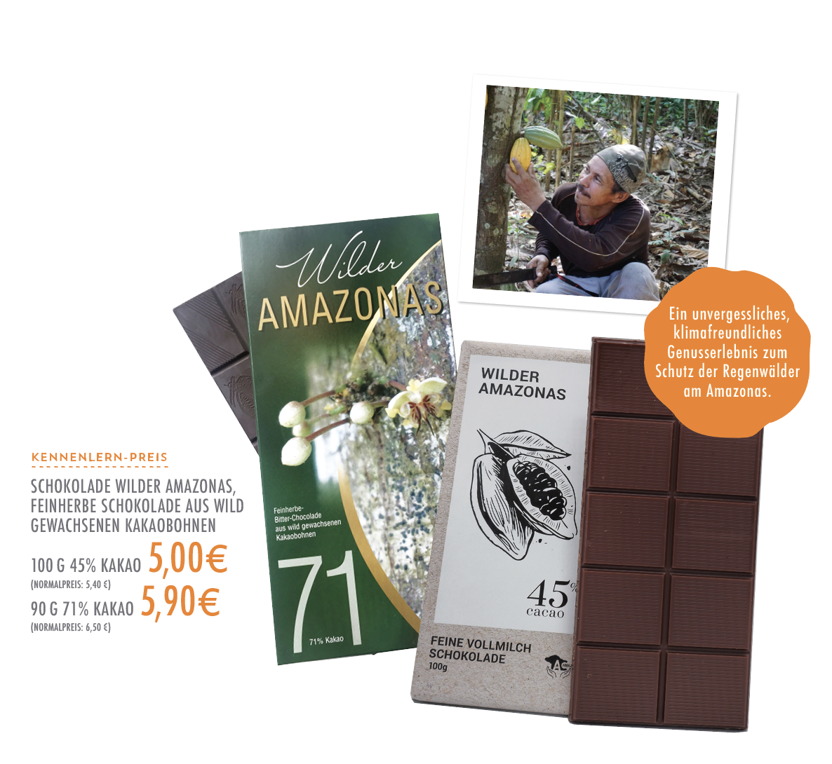 Das Produkt des Monats gibt es jeden Monat zum Kennenlernen zu einem Sonderpreis: Schokolade Wilder Amazonas, 45% Kakao (100 g), Normalpreis 5,40 €, Angebotspreis 5,00 €; Schokolade Wilder Amazonas 71% Kakao (90 g), Normalpreis 6,50 €, Angebotspreis 5,90 €.